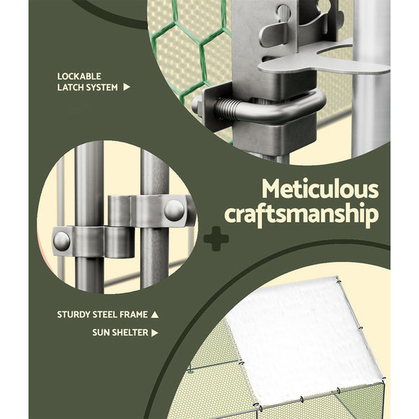 Our Walk-in Pet Enclosure / Chicken Coop designed for the comfort and safety of your chickens, geese, cats, dogs and ducks. This enclosure boasts a sturdy galvanised steel frame. Ease of access is guaranteed with a spacious entrance, seamlessly leading to a secure environment provided by the robust steel mesh panel and latches. Above, a roof section boasts a sun shelter, offering a serene hideout spot. Thoughtfully designed for straightforward assembly, this enclosure stands as the ideal home for your pets.